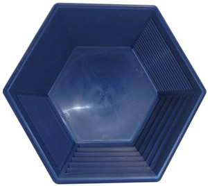 One of the most unusual but completely functional pan designs ever. The hexagonal shape allows for two sets of deep primary riffles to form an amazingly efficient gold trapping trough. There are also two sets of sixteen secondary riffles for basic clean up, and two sides with a textured surface for final clean up. When you experience the gold catching effect of panning in a trough you will wonder why it took so long for someone to figure it out. The Hex Pan is 15 inches across, three inches deep, and is made of very durable polypropylene plastic. The Hex Pan is available in four colors, black, blue, green, and purple.