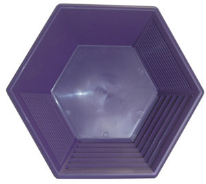 One of the most unusual but completely functional pan designs ever. The hexagonal shape allows for two sets of deep primary riffles to form an amazingly efficient gold trapping trough. There are also two sets of sixteen secondary riffles for basic clean up, and two sides with a textured surface for final clean up. When you experience the gold catching effect of panning in a trough you will wonder why it took so long for someone to figure it out. The Hex Pan is 15 inches across, three inches deep, and is made of very durable polypropylene plastic. The Hex Pan is available in four colors, black, blue, green, and purple.