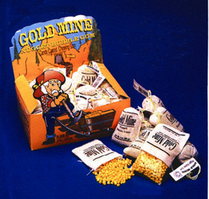 Draw string cloth bags labeled Gold Mine. Looks just like an old prospectors gold poke. The candy coated gum is gold colored and looks like small gold nuggets. Each bag contains 2 ounces of gum.