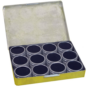 These sets all contain 1 1/4 inch aluminum gem jars in boxed sets. The gem jars are made of aluminum with clear plastic inserts in the lid and a black foam insert. The boxes that hold the jars are either aluminum or wood. This aluminum display box is 5 x 4 x 3/4 inches and comes complete with 12 aluminum gem jars with black foam inserts.