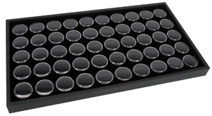 These clear plastic jars with either black or white foam fillers come in three sizes. They are perfect for displaying your gold, gemstones, coins, beads or whatever. Includes display jars in a plastic foam lined stackable tray. The tray is 14 inch x 8 inch and the jars are available in three sizes. Choose either white or black foam in the tray and in the jars. 50 of the 1 1/4 inch display jars in the tray. Specify white or black foam.