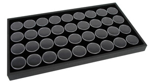 These clear plastic jars with either black or white foam fillers come in three sizes. They are perfect for displaying your gold, gemstones, coins, beads or whatever. Includes display jars in a plastic foam lined stackable tray. The tray is 14 inches x 8 inches and the jars are available in three sizes. Choose either white or black foam in the tray and in the jars. 36 of the 1 1/2 inch display jars in the tray. Specify white or black foam.