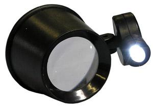 10 x jewelers eye loupe with a glass lens. It has an attached LED light that is adjustable to focus the light on the subject. The LED light is powered by a button style battery which is included.