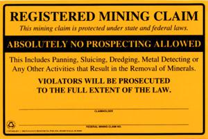 These aluminum claim signs are the perfect answer to a clear and inexpensive way to clearly mark your claims so that other prospectors can avoid them. They are bright yellow and professionally produced. The No Prospecting Sign is 11 inches wide and 7