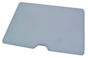 White plastic, 6 inch by 8 inch, 3/8 inch thick, provides a clean cutting surface.